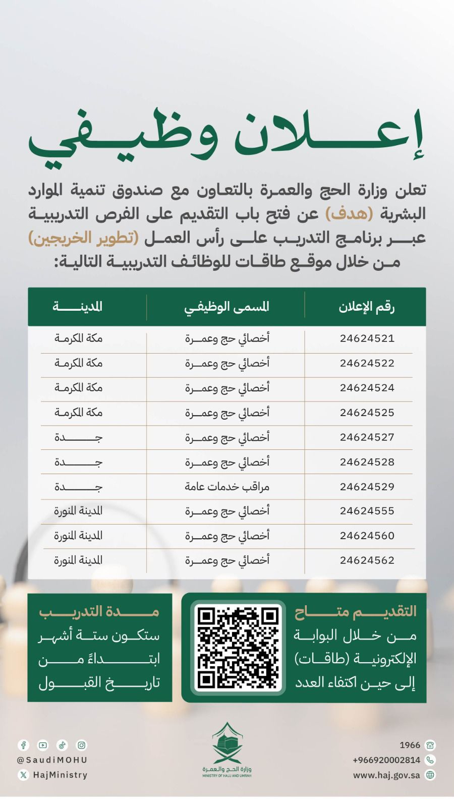 وزارة الحج والعمرة تعلن عن مجموعة من الفرص التدريبية، بالشراكة مع صندوق تنمية الموارد البشرية “هدف”، وتدعو الراغبين للتقديم عبر البوابة الإلكترونية “طاقات”، وذلك وفقًا للتفاصيل الموضحة أدناه.